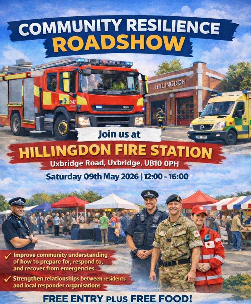 Residents will be able to meet local responder partners including Hillingdon Council, London Ambulance Service (LAS), London Fire Brigade, Met Police Service, the Environment Agency, Affinity, British Red Cross, the Military, Rapid Relief Team and the Hillingdon Federation of Community Associations. They'll be able to explore emergency vehicles, take part in fun hands‑on activities, and learn practical steps to keep themselves, their family, and neighbours safe. For example, the LAS will be teaching CPR.