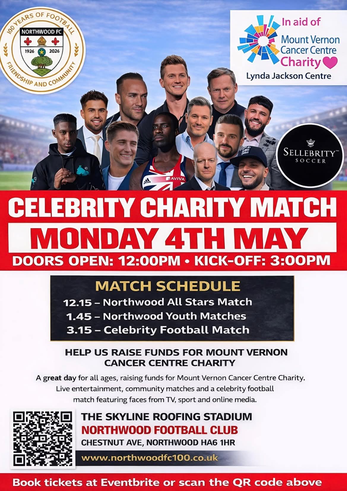 Tickets are selling fast for our Celebrity Charity Match hosted by Sellebrity Soccer on Bank Holiday Monday, 4th May 2026 at the Skyline Roofing Stadium - all in support of Mount Vernon Cancer Charity.